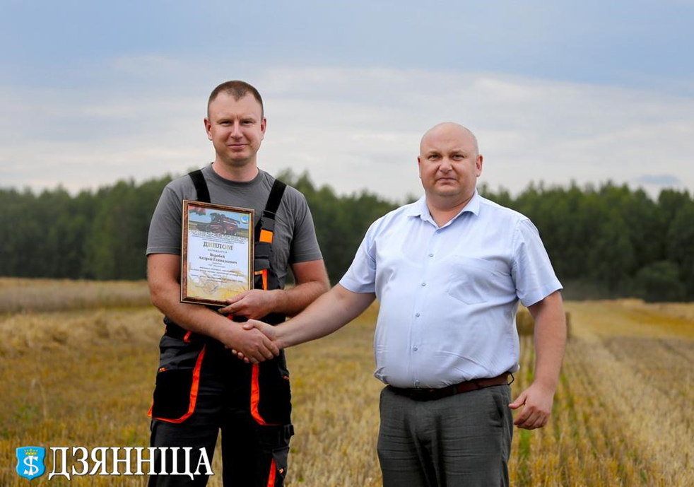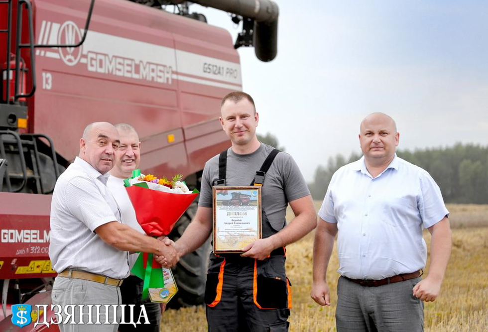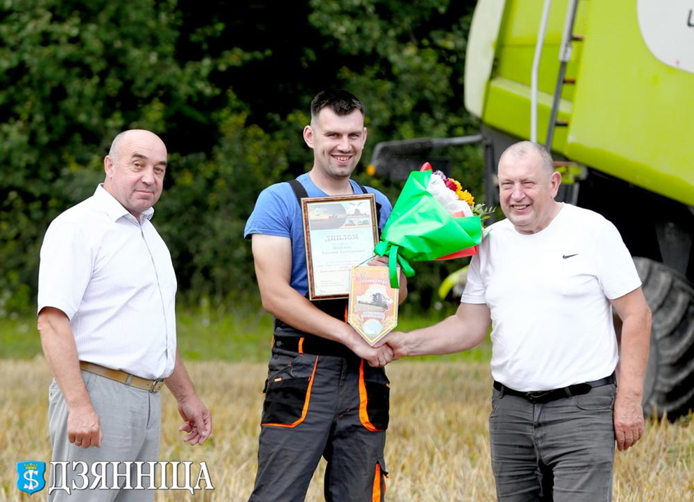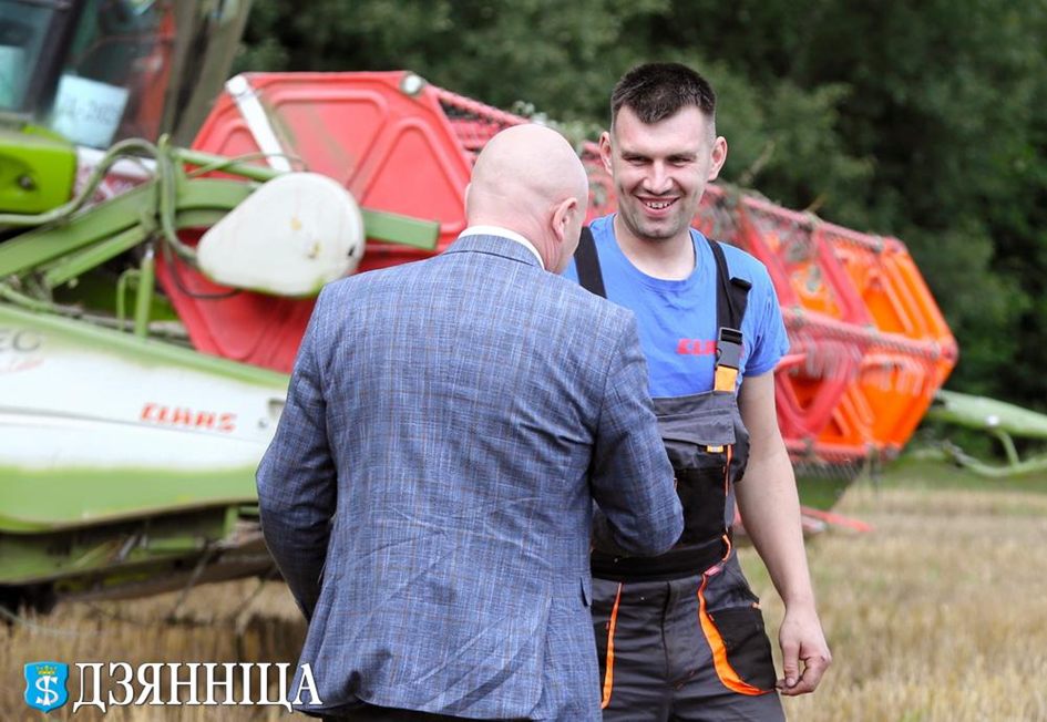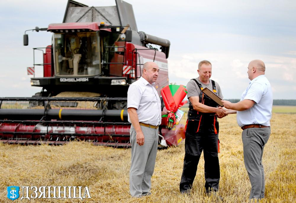 Начало дня ознаменовалось торжественным чествованием передовиков. Первый заместитель председателя райисполкома Игорь Аверко и председатель райкома профсоюза работников АПК Генрых Юревич проехали по нескольким хозяйствам, чтобы лично поздравить комбайнеров, покоривших заветный рубеж в 1000 тонн намолота.