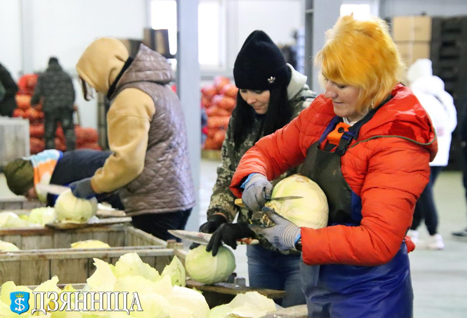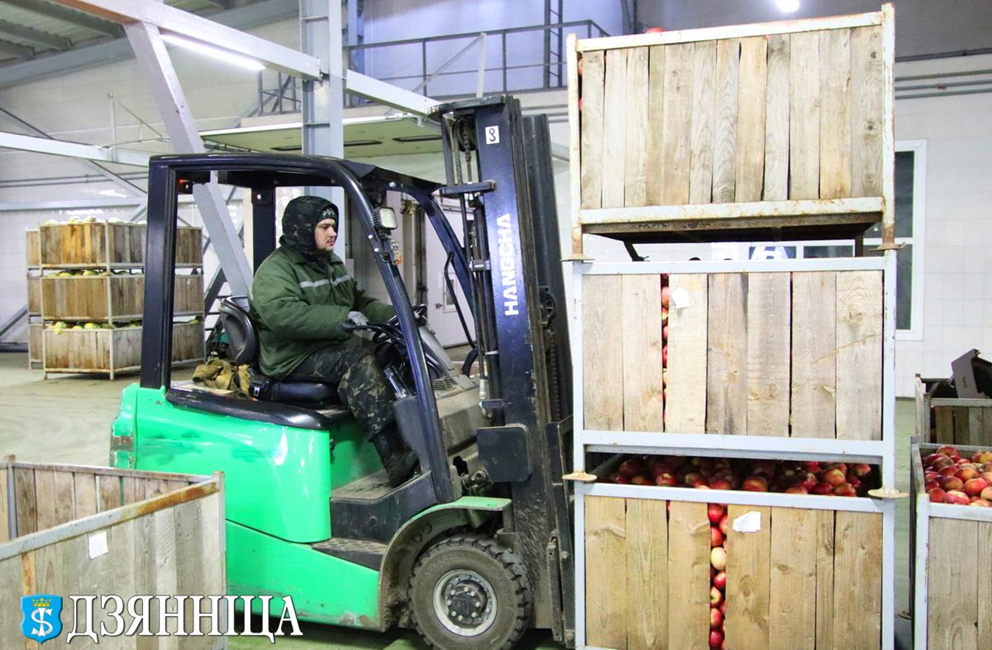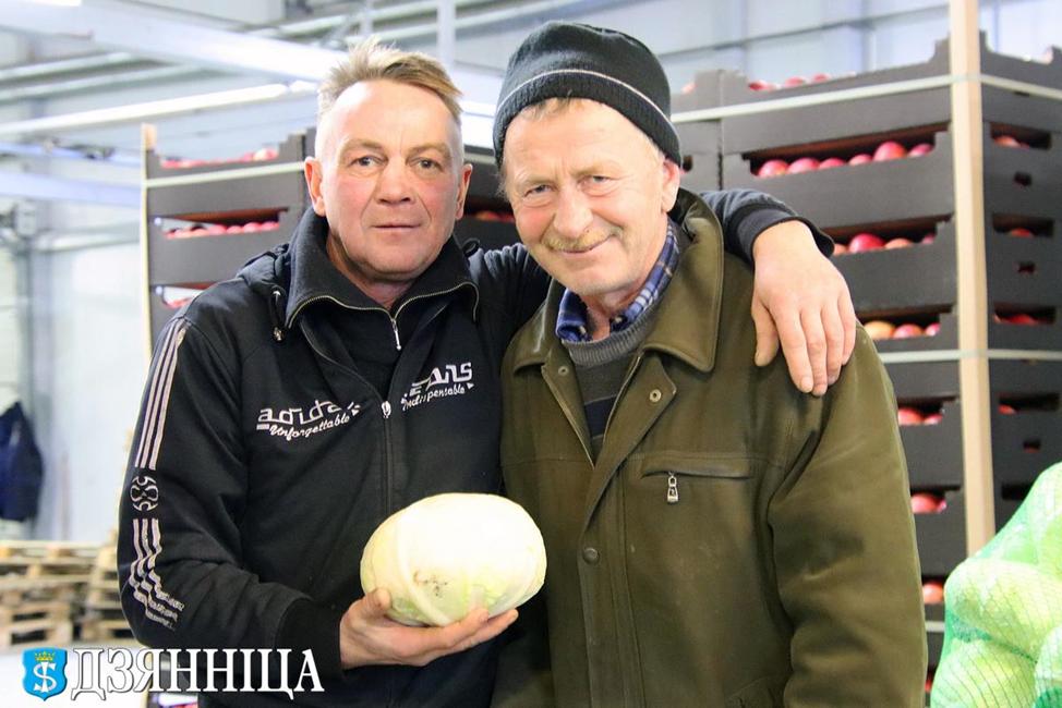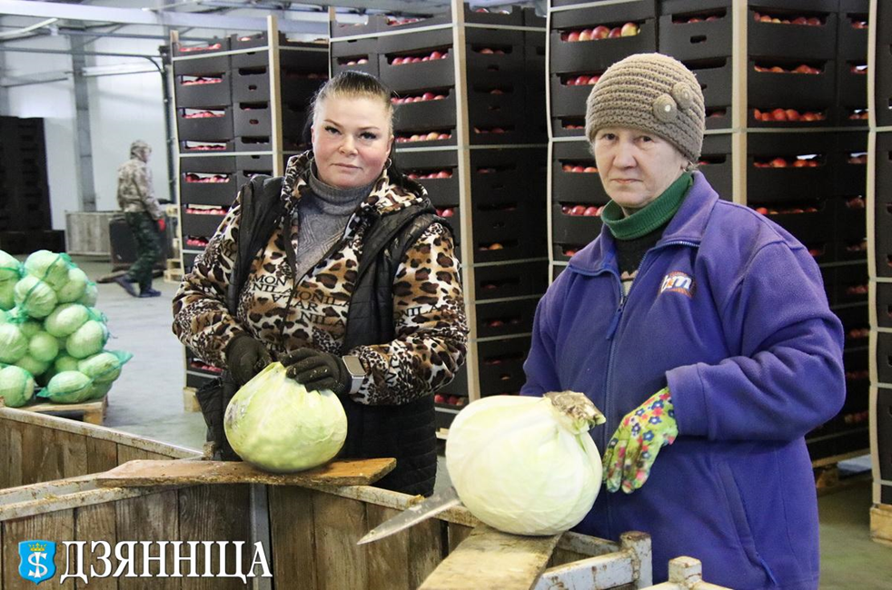 Большую часть рабочей силы склада составляют сезонные рабочие. Сейчас в цехе сортировки продукции готовят партию капусты для магазинов торговой сети «Евроопт». Женщины и мужчины тщательно очищают кочаны капусты и заворачивают их в сетки. Далее продукция загружается в транспорт. Большая рампа может одновременно вместить до десяти грузовиков.